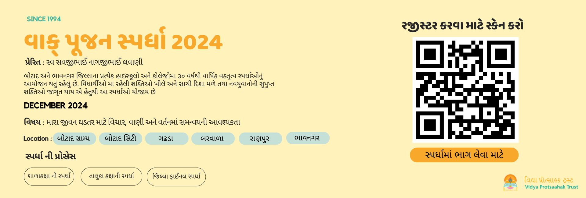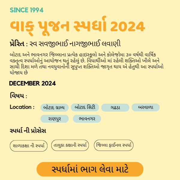 સ્પર્ધાનું નામ : સ્વ. સવજીભાઈ નાગજીભાઈ લવાણી પ્રેરિત – વાક્ પૂજન સ્પર્ધા